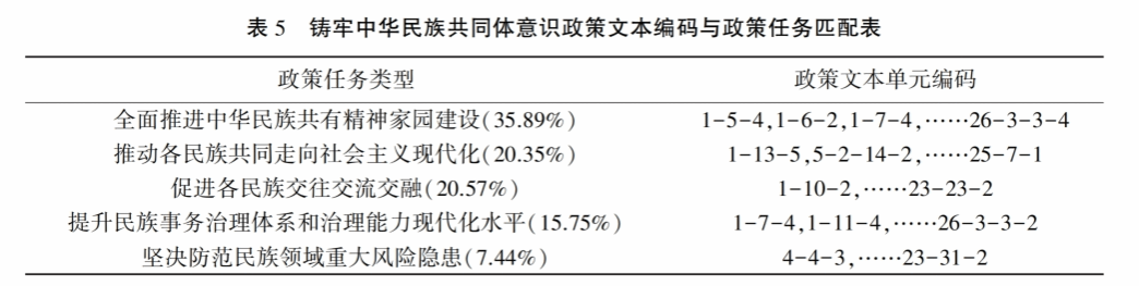 根据政策任务框架的编码流程,将457个参考点归类到对应的政策任务树节点中,并统计出各个政策任务的分布情况(见表5)。从整体上看,铸牢中华民族共同体意识政策文本涵盖了全面推进中华民族共有精神家园建设、推动各民族共同走向社会主义现代化、促进各民族交往交流交融等五类任务,但每类政策任务在具体分布上明显不均衡。其中,“全面推进中华民族共有精神家园建设”所占比例最大,达到35.89%;“促进各民族交往交流交融”和“推动各民族共同走向社会主义现代化”占比次之,分别为20.57%、20.35%;而“提升民族事务治理体系和治理能力现代化水平”“坚决防范民族领域重大风险隐患”二者所占比重均低于20%,占比分别为15.75%、7.44%。