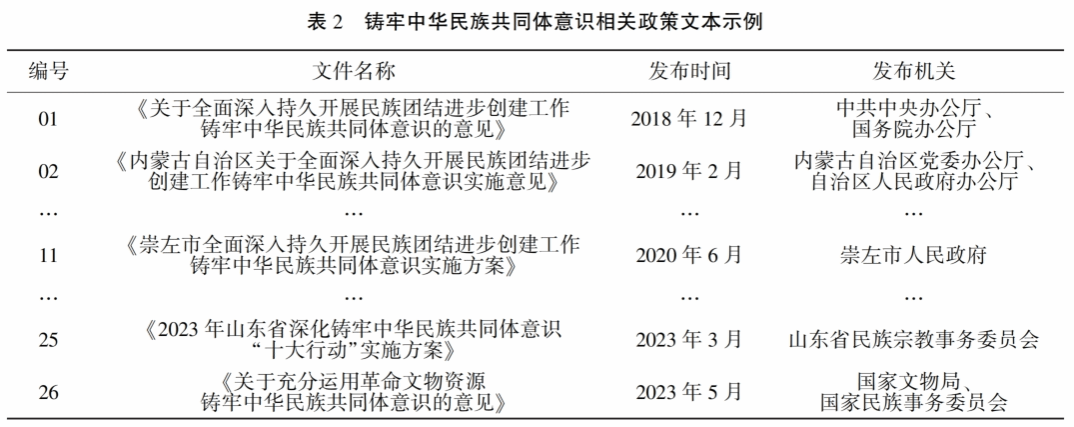 基于全面性、公开性、时效性、精准性、权威性等原则,通过浏览政府及其相关部门官网,以“铸牢中华民族共同体意识”“中华民族共同体意识”等为关键词进行检索,搜集“意见”“通知”“办法”“决定”等形式的与研究主题契合的政府政策文本。此外,借助中国知网法律法规和政府文件数据库、北大法宝数据库对相关政策文本进行补充。为保证政策文本选取的有效性,剔除“表彰”“公告”“命名”“公示”“解读”“征求意见稿”等形式的程序性政策文本,最终确定选取与“铸牢中华民族共同体意识”相关度较高的政策文本26份(见表2)。具体遵循的标准为:第一,考虑到“铸牢中华民族共同体意识”提出的时间节点,本文将检索时间跨度设置为2017年10月至2023年6月;第二,考虑到政策文件时效性,针对同一政府,本文选取其最新版本政策;第三,选取的政策文本必须是各级政府部门正式颁布实施的;第四,选取标题明确带有“铸牢中华民族共同体意识”且内容与其相关性较高的政策文本;第五,选取“意见”“通知”“办法”“决定”“规划”“方案”等形式的政策文本。