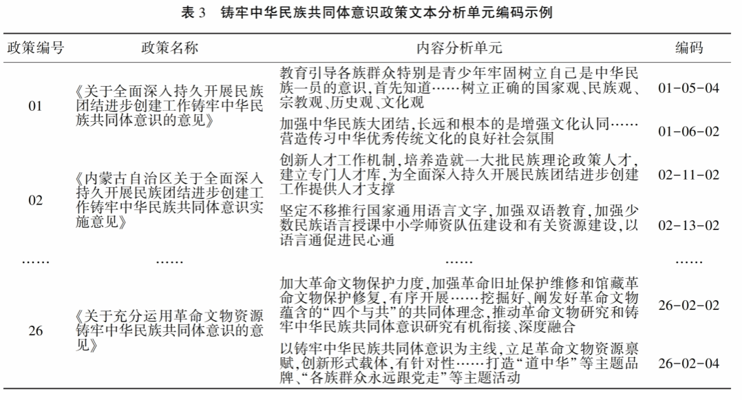 本文选用Nvivo12质性分析软件对铸牢中华民族共同体意识政策文本进行编码。其中,以X维度为参照进行编码的操作流程如下:第一步,将搜集到的26份铸牢中华民族共同体意识政策文本导入Nvivo12软件。第二步,在软件中建立供给型、需求型、环境型政策工具三个树节点以及相应次级政策工具子节点。第三步,对政策文本进行逐字、逐句阅读,按照“政策编号—政策章节—政策条款”三段式编码原则,结合其语义,将26份政策文本转化为可量化的分析单元,并将这些分析单元作为参考点相对应地归类到子节点中,共得到457个参考点。政策编号遵循政策文件发布的时间顺序,按照01至26进行编码;政策章节编号遵循各政策文件中政策章节出现的先后顺序,按照01至50进行编码;政策条款编号遵循各政策文件中政策条款出现的先后顺序,按照01至99进行编码(见表3)。在此基础上,计算出X维度编码的信度分析评估结果为0.826,确保编码结果可靠。
