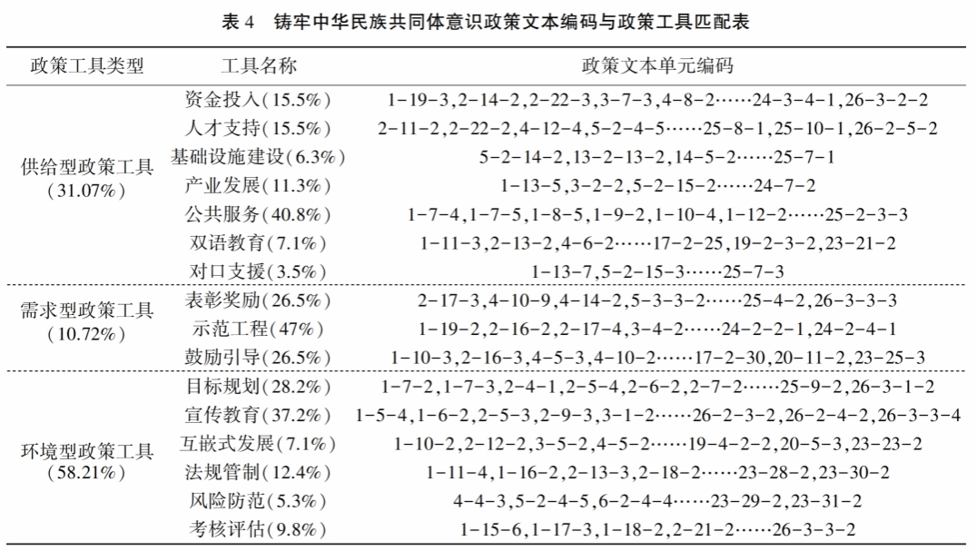 政策工具是政府为了实现政策目标而在公共政策执行过程中所采用的行为方式,即政策工具是连接政策目标与政策效果的桥梁。基于特定的标准,政策工具可划分为不同类别。如豪利特、拉米什依据政府权力直接介入程度将政策工具分为强制、混合、自愿三种;Hood从政策资源运用程度将政策工具划分为劝告、法律、补助、服务的传送、调查、登记、咨询和统计等八种类型;McDonnell等则依据政策目标导向将其分为命令型、激励型、能力建设型和系统变化型工具。此外,Rothwell等按照政策影响层面差异将政策工具区分为供给型、需求型、环境型三种类型。纵观这些政策工具分类可知,每种类别均对应于特定场景,且通过对各具体政策工具的组合配置,以发挥政策工具体系的协同效应。相对来说,Rothwell等人构建的政策工具“三分法”的包容性、操作性更好。在包容性方面,此分类框架弱化了政策工具的强制性特性,强化了在政策执行过程中政府环境营造者角色,突出了供需在实现政策目标中的重要性。在操作性方面,此分类方法从工具和措施两方面对繁杂的政策体系给予了降维处理,具有良好的聚合效度和区分效度,有利于具体操作呈现。正是基于该分类框架的上述优势,我国一些学者将其运用于铸牢中华民族共同体意识相关领域,如民族团结进步条例、城乡社区治理政策、乡村振兴政策等。与此同时,推进铸牢中华民族共同体意识工作过程中所采取的加大中华民族共同体建设的资源保障力度,营造良好的政治、经济、社会、法治环境以及激发地方各级政府、各单位、社会公众需求等举措,与Rothwell等人构建的政策工具分类框架具有内在逻辑的高度契合性。基于此,本研究借鉴Rothwell等人的政策工具“三分法”,立足我国铸牢中华民族共同体意识的实践逻辑,分析当前我国铸牢中华民族共同体意识政策文本的政策工具使用现况。