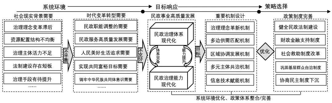 综上所述,民政治理体系与治理能力现代化是一个多系统、多维度和多层次的概念。从完整的结构上来讲,民政治理体系与民政治理能力之间是结构与功能、硬件与软件的关系,二者相互依存、相辅相成,构成了价值与行动的统一、过程与效果的统一。从表现形式上看,民政治理体系与治理能力现代化可以体现为民政的制度机制、管理模式、价值理念、治理技术、公共服务能力、民政职能转型、市场化与社会化、内部环节配套等要素不断丰富发展和完善成熟的过程。