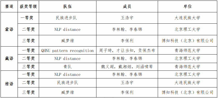 发布会由专委会秘书长张华平研究员主持,会议过程同步在B站上进行了直播。本次评测针对图像描述生成任务,在公开数据集Flickr8k的基础上汇集整理了蒙古语、藏语和维吾尔语三个语种的评测数据集,分别开展图像生成技术评测。本次评测从2023年9月16日发布任务至10月12日截止回收评测结果,共计收到蒙古语5个队伍、藏语7个队伍、维吾尔语5个队伍报名参赛,涵盖高校、科研机构以及企业界的参赛队伍,最终收到蒙古语10个结果、藏语12个结果、维吾尔语10个结果。评测采用与Microsoft COCO Caption Evaluation相同的评估指标,包括BLEU(1-4)、METEOR、ROUGE、CIDEr进行综合评估。评测结果如下: