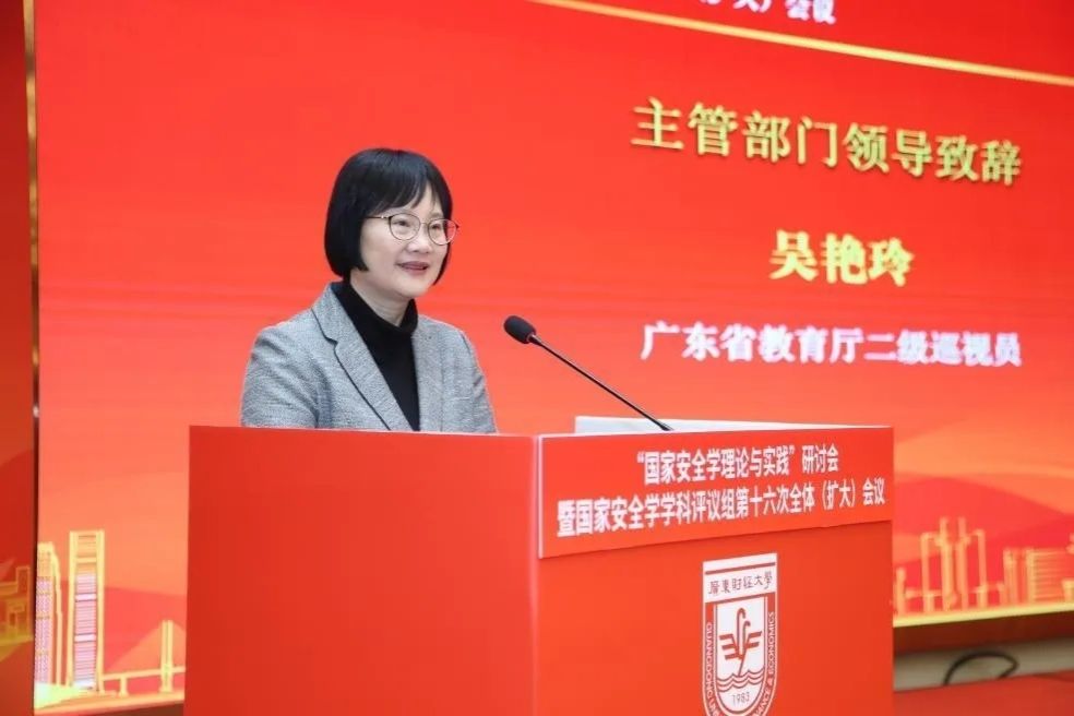 广东省教育厅二级巡视员吴艳玲代表广东省教育厅致辞,对会议顺利启幕表示祝贺,强调国家安全学学科建设的重要性,并且支持广东财经大学建设与发展,为助力省内高校加强国家安全学学科建设,提供广财经验和贡献广财智慧。