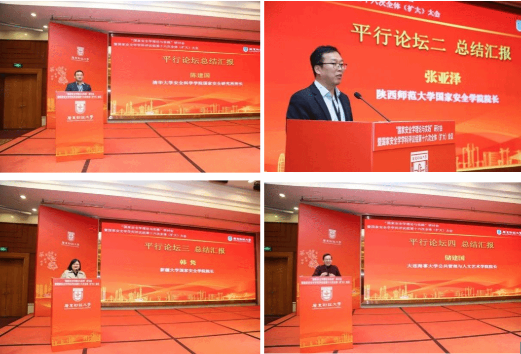 总结会议于1月4日16:40—17:50举行,并由程琳教授主持大会总结。清华大学安全科学学院国家安全研究所所长陈建国,陕西师范大学国家安全学院院长张亚泽,新疆大学国家安全学院院长、政治与公共管理学院院长韩隽,大连海事大学公共管理与人文艺术学院院长储建国依次作为四个平行论坛代表进行总结,梳理学科发展脉络。