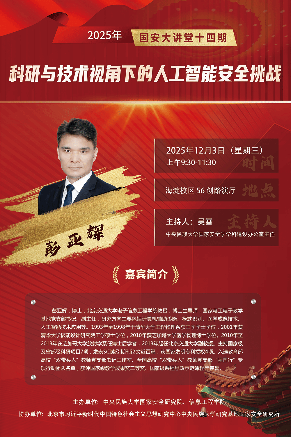 将于2025年12月3日举办“国安大讲堂”第十四期,具体安排如下: