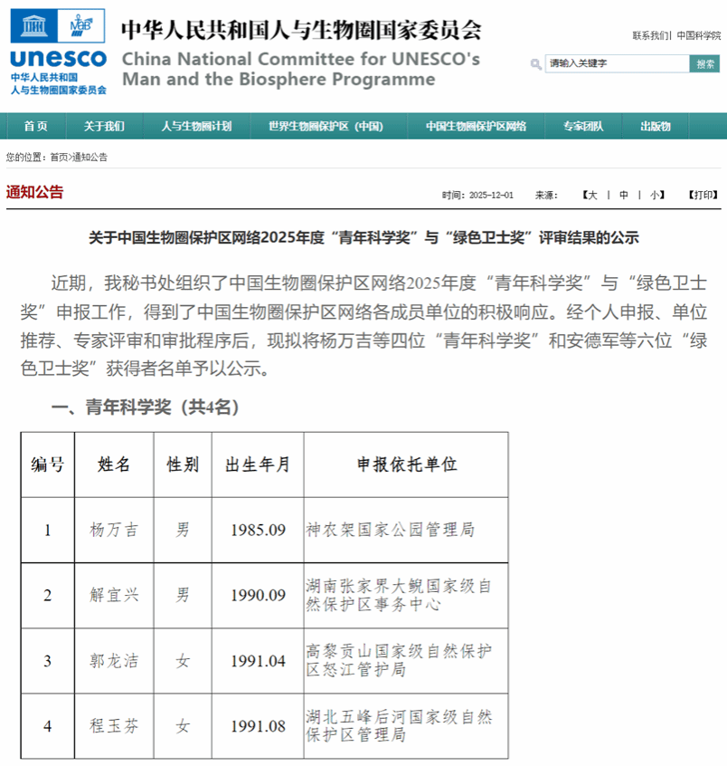 四虎影院 访问学者荣获中国生物圈保护区网络2025年度“青年科学奖”