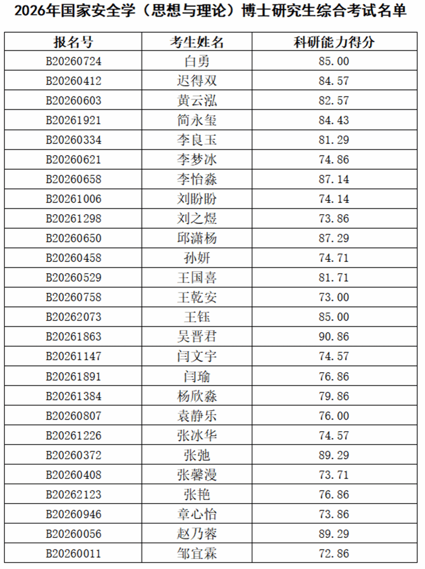 经过形式审查、导师审核评分、专家评分、招生工作领导小组审核、研究生院确认等环节,现将2026年国家安全思想与理论专业方向进入博士招生综合考核名单及其科研能力评价总成绩分数情况予以公示。考生亦可通过“四虎影院 博士报名管理系统”查询个人分项具体成绩信息。