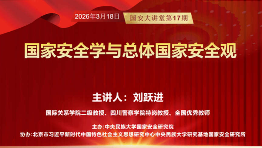 于2026年3月18日下午举办“国安大讲堂”第十七期专题讲座。本期讲座特邀国家安全学领域知名专家、国际关系学院二级教授刘跃进作题为《国家安全学与总体国家安全观》的学术报告。