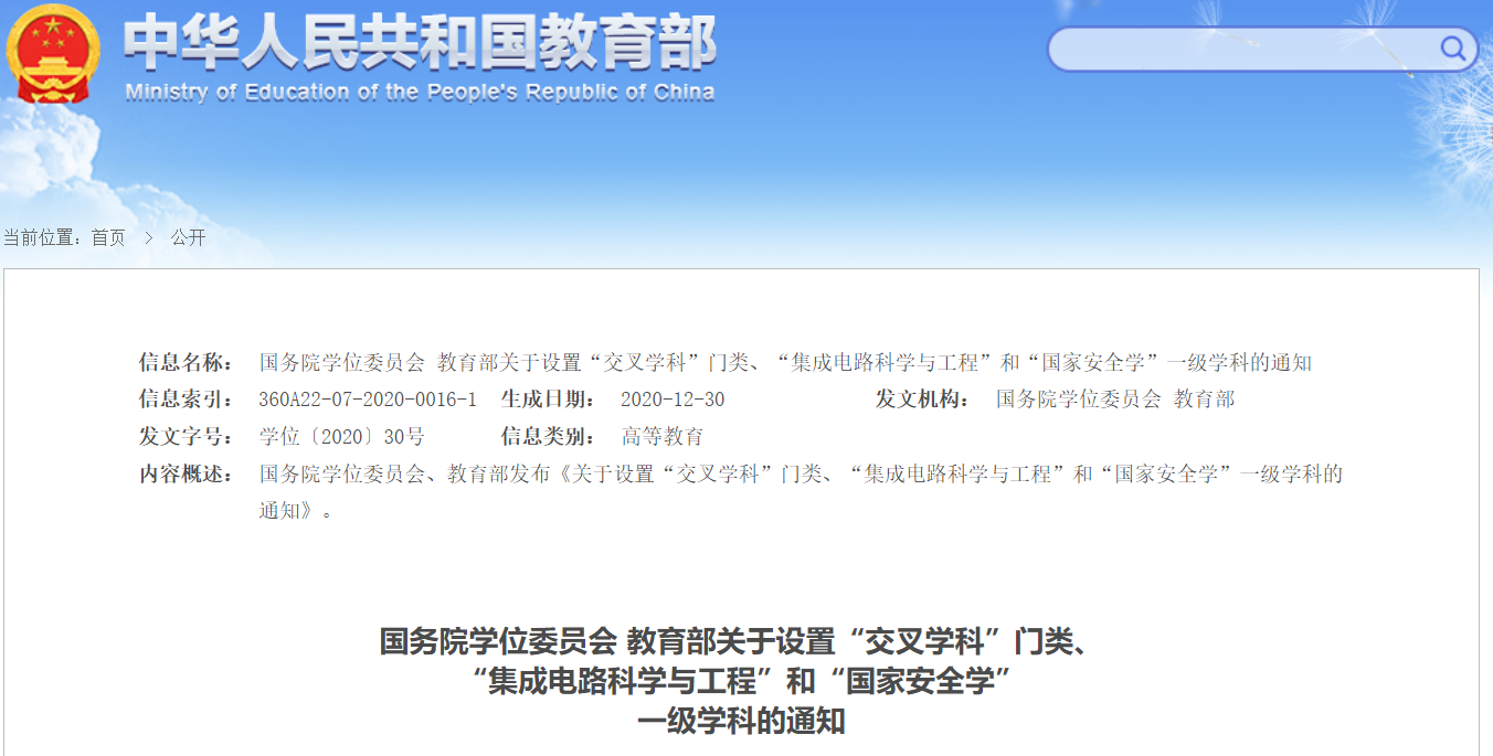 2020年12月,国务院学位委员会、教育部联合发布关于设置“交叉学科”门类、“集成电路科学与工程”和“国家安全学”一级学科的通知,决定设置“交叉学科”门类(门类代码为“14”)、“集成电路科学与工程”一级学科(学科代码为“1401”)和“国家安全学”一级学科(学科代码为“1402”)。